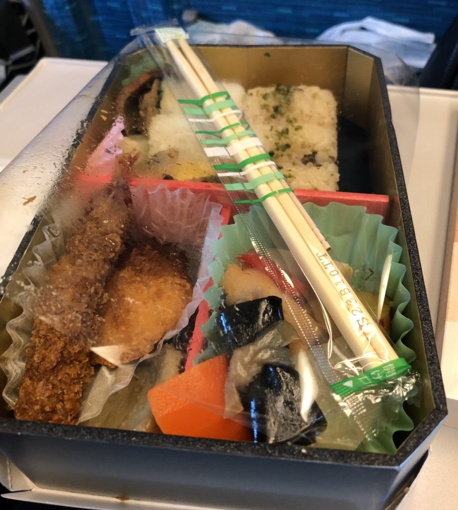 Natürlich haben wir uns die obligatorische Eki(Bahnhofs)-Bento geholt. Manches konnten wir keiner uns bekannten Lebensmittelgruppe zuordnen, lecker war es trotzdem und verträglich 😉